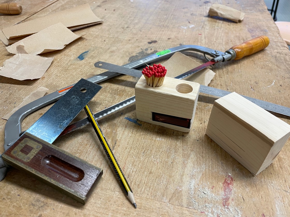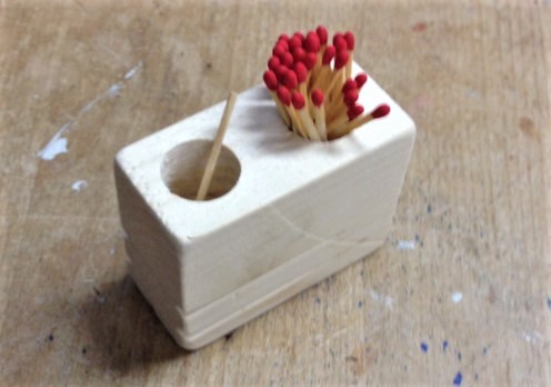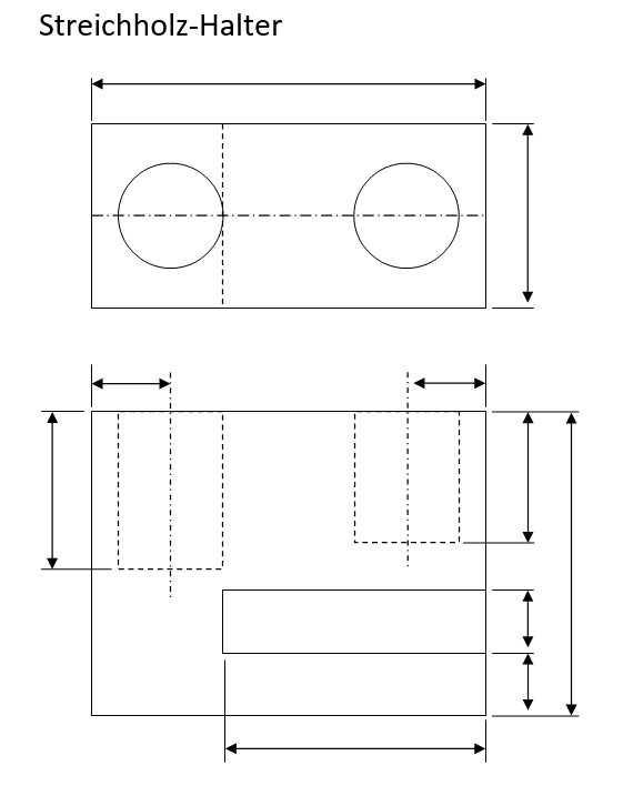 Das kleine Projekt sollte ein Streichholzhalter werden. Dieser hat einen Einschub für die Reibfläche und zwei große Löcher für die Streichhölzer und deren abgebrannten Reste. Eine Dachlatte aus Fichtenholz wurde dazu in passende Stücke gesägt.