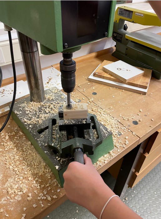 Zwei Sägeschnitte für die Reibfläche waren schon vorbereitet, mussten aber noch etwas geschliffen werden. Mit einer Schablone wurden dann die Bohrungen für den Forstnerbohrer markiert. Einige Schülerinnen und Schüler haben das erste Mal an der Ständerbohrmaschine gearbeitet.